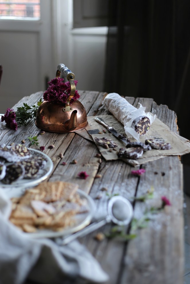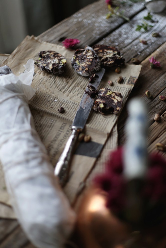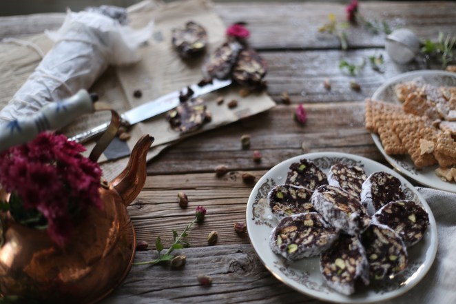 In una ciotola capiente montate zucchero e burro, quando il composto sarà spumoso aggiungete un uovo per volta, Sminuzzate i biscotti, aggiungeteli insieme ai pistacchi ed infine il cacao in polvere. Mescolate per bene l’impasto e quando sarà pronto trasferitelo in un foglio di carta forno, rotolatelo e create la forma di un salame, chiudendo le due estremità. Fatto ciò riponetelo o in frigo per qualche ora oppure in freezer per mezzora. Quando si sarà ben rassodato, cospargetelo di zucchero a velo e magari perché no, legatelo con dello spago così da sembrare più realistico possibile.