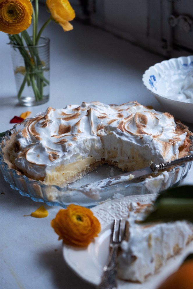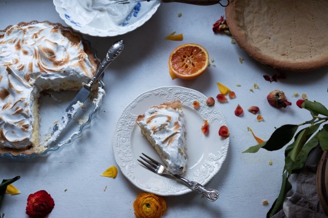“Quel pomeriggio a farmi compagnia c’erano i fiori, la voglia di abbandonarmi ancora una volta e il succo color del sangue a tingere le mie mani… Mentre la crostata stava per raffreddarsi, tutto attorno a me aveva un sapore diverso. Chissà, forse sarà stato il silenzio assordante. Con le dita la curiosità di assaggiare la crema oramai quasi pronta… Quel gusto così dolce e acidulo al tempo stesso da farmi venire le fossette! (Pasticceria è pazienza, ed il tempo è l’ingrediente fondamentale, si sa!) Tra un attesa e l’altra mi misi a leggere per poi finalmente dedicarmi a quella dolce nuvola bianca.”