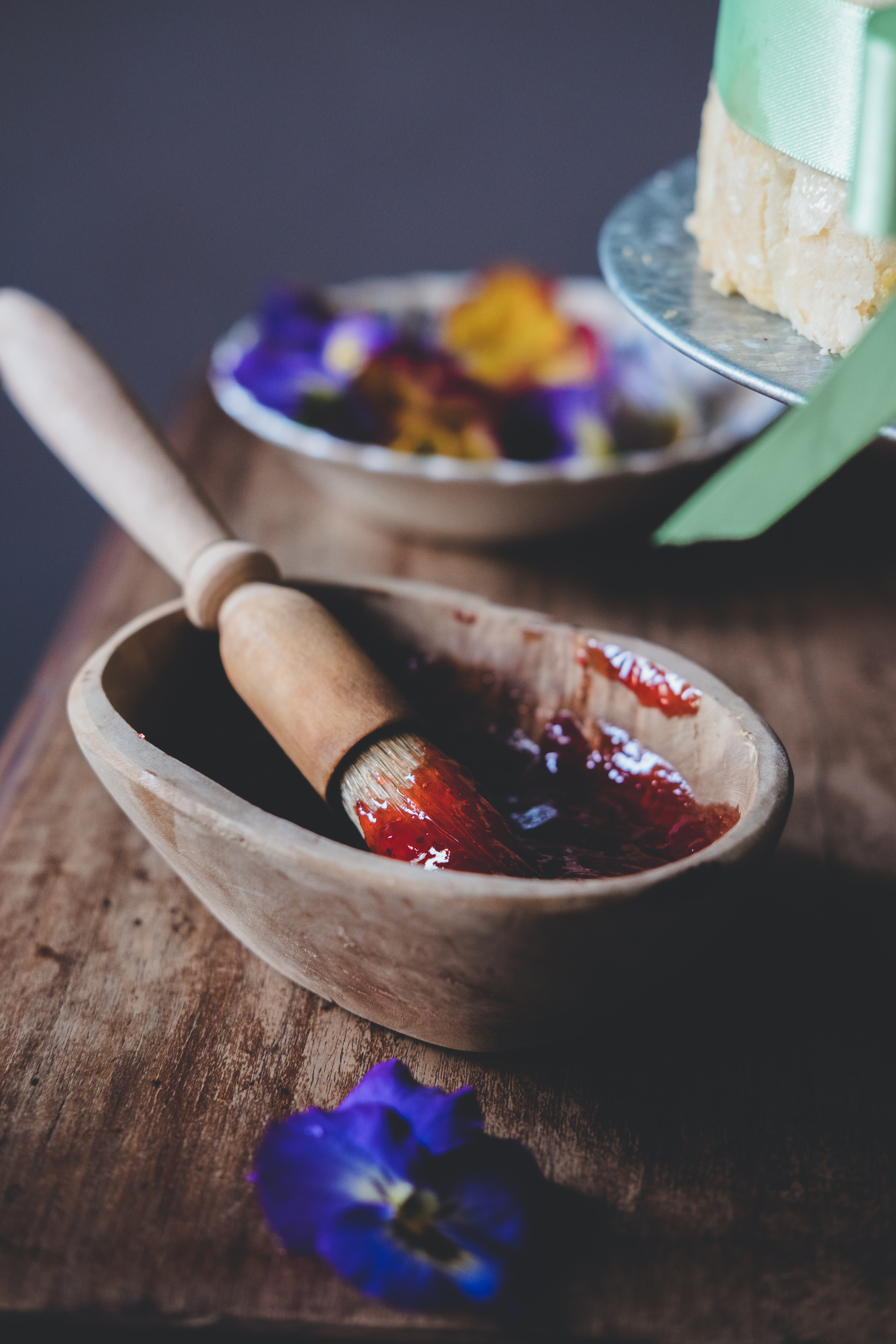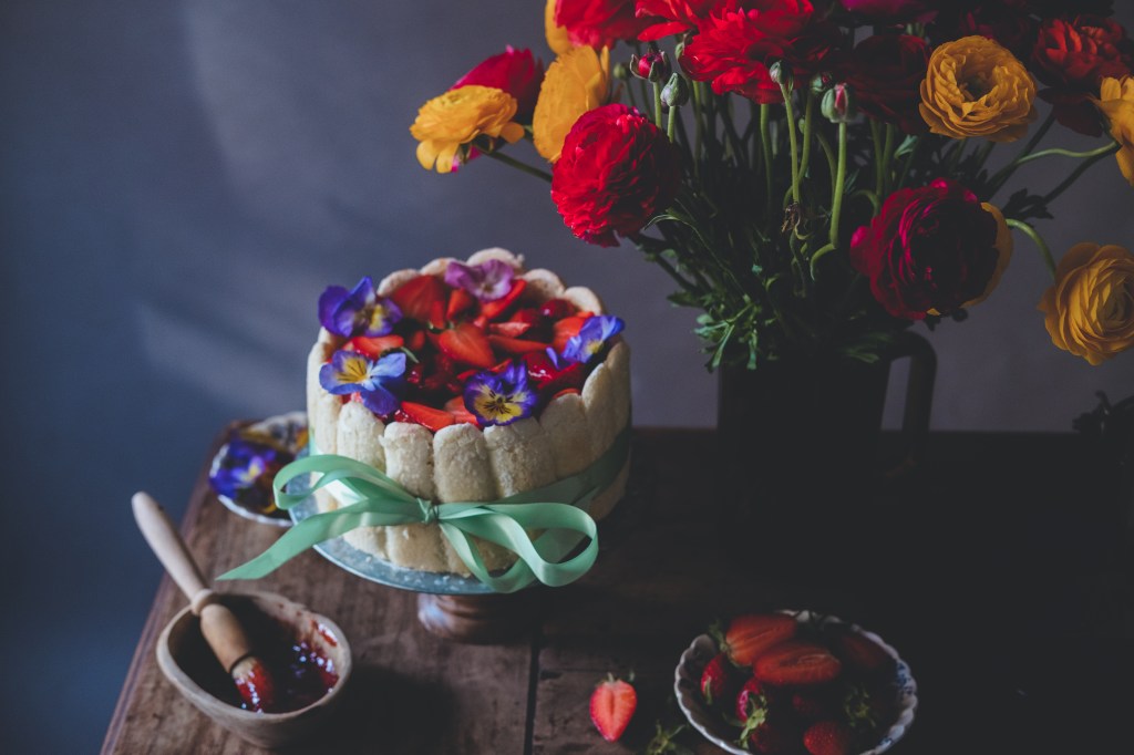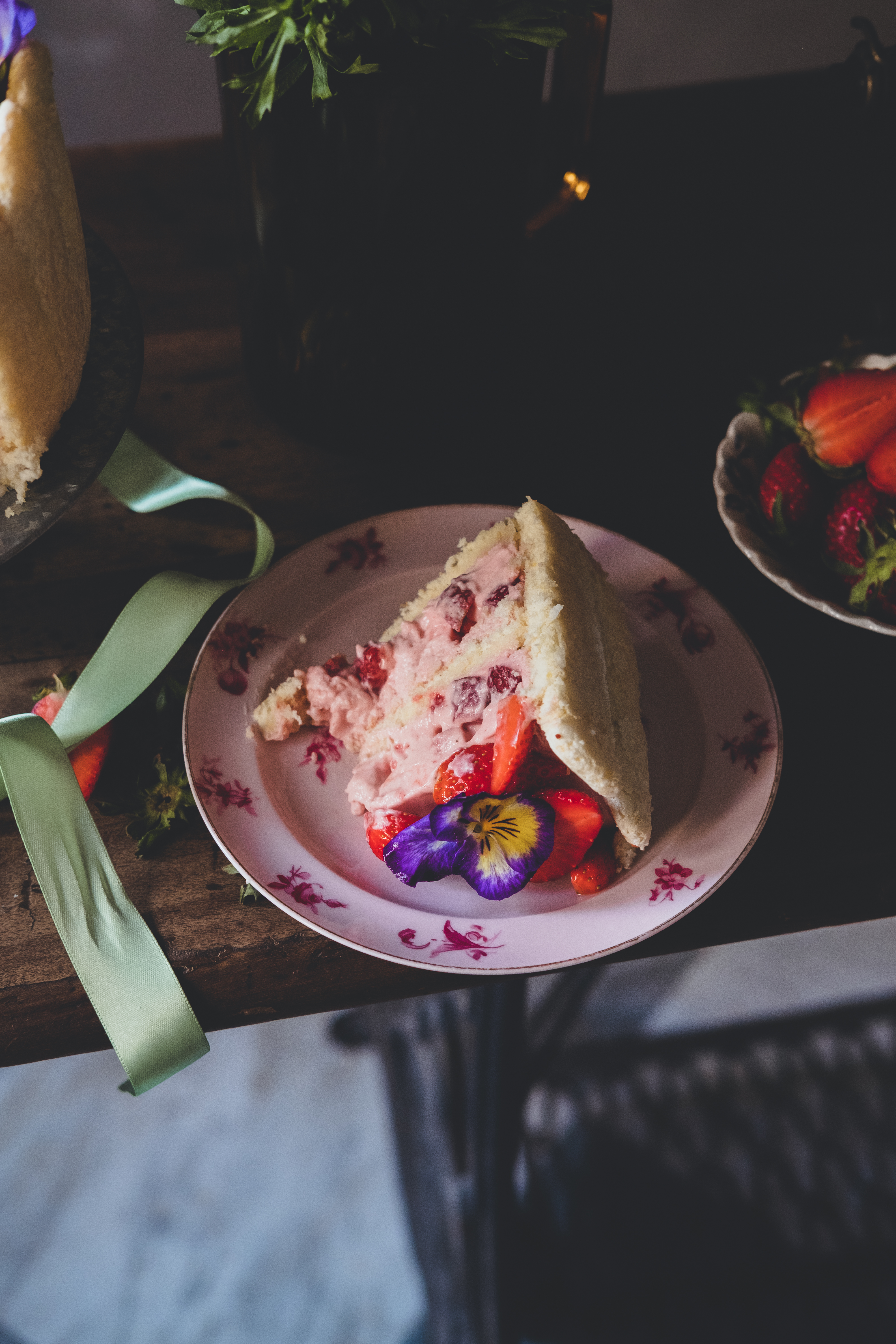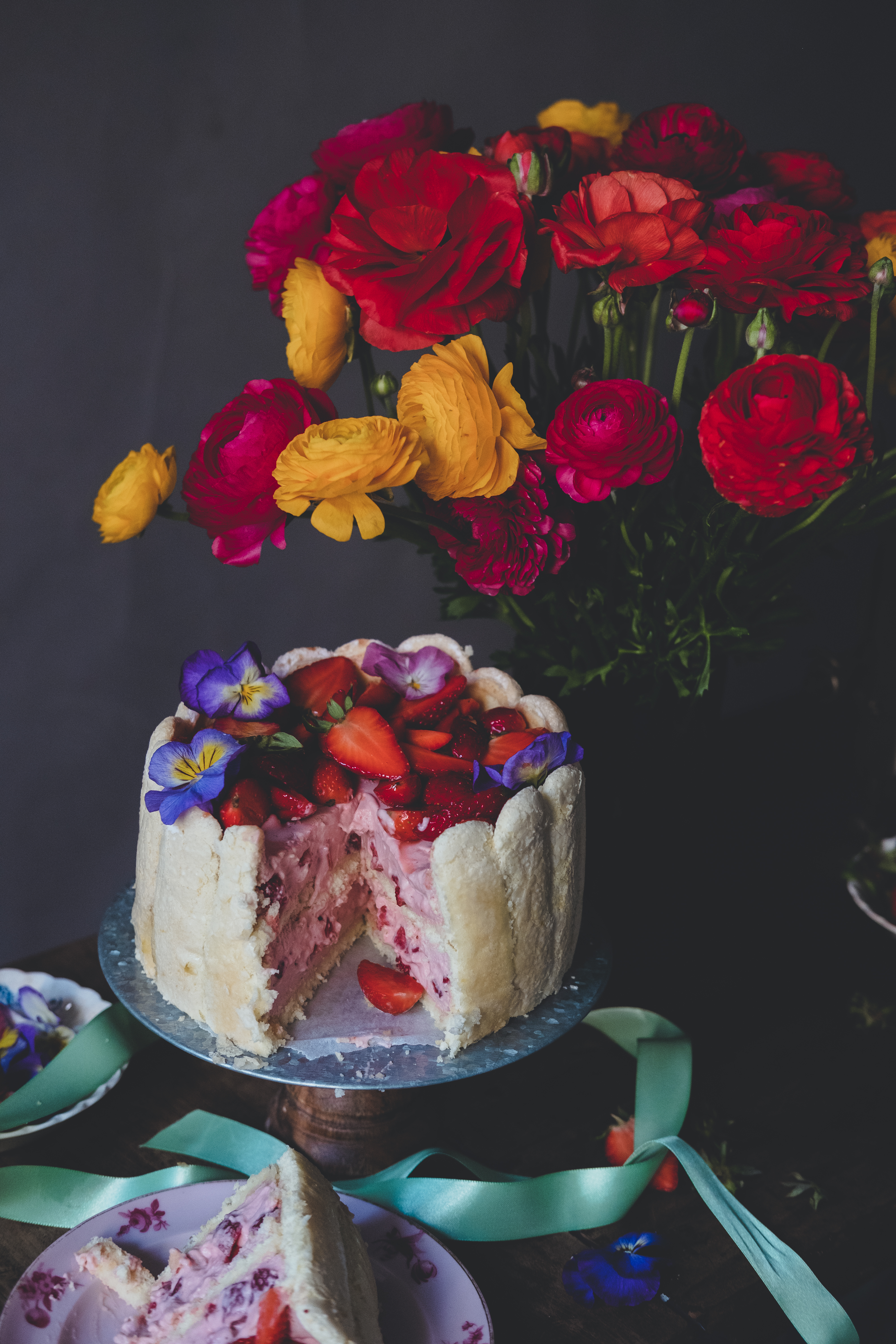 Accertatevi che la polpa si ben fredda e ultimate la preparazione della mousse. Riprendete la ciotola riposta in frigo con il composto montato. Versate poco per volta la polpa al composto montato, cercate di amalgamare per bene con l’aiuto di una spatola di gomma o detta anche Marisa, dal basso verso l’alto, continuate con questo procedimento affinché la polpa non sarà finita. Adesso potrete iniziare a montare la torta. Bagnate la base della torta con lo sciroppo, versate giusto due- tre cucchiaiate di mousse, cospargete i pezzetti di fragole uniformemente e versate altre cucchiaiate di mousse, pareggiate per bene e riponete la torta in freezer per giusto 20 minuti. Trascorsi i venti minuti inserite l’altro disco della biscuit, bagnatelo con lo sciroppo e via! Due-tre cucchiaiate di mousse, pezzetti di fragole, altre cucchiate di mousse quali fino al limite. Riponete la torta in frigo tutta la notte per far sì che si rassodi per bene. L’indomani mattina non vi resterà altro che guarnirla, credo sia la parte più bella. Fragole a tempesta, spennellata di confettura di fragole e magari o delle foglioline di menta oppure come ho fatto io, con dei bellissimi fiori eduli. E per finire togliete la cerniera allo stampo e definite la torta con un bel nastro dai toni pastello.